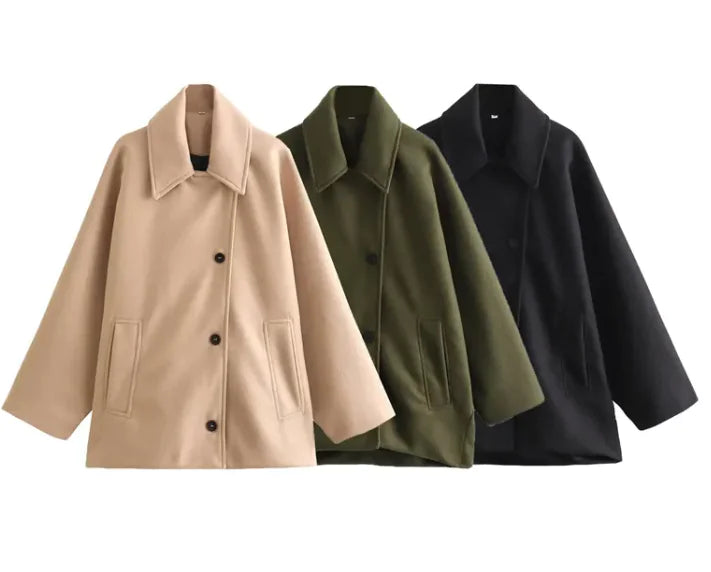 Elevate your everyday style with this chic, loose-fit wool blend coat, available in timeless colors like Army Green, Black, and Camel. Designed for a relaxed yet polished look, this coat offers both comfort and sophistication, making it perfect for the modern professional on the go.