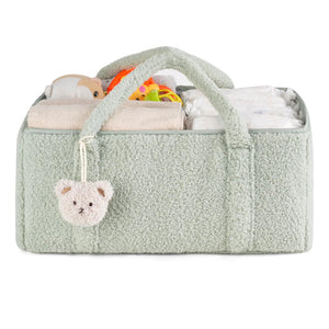 Dahey Diaper Caddy OrganizerBaby basket for all baby items:DiapersBaby wipesBaby bibsNursing padsBaby clothesBaby toysBreast PumpCreamsLotionsOther baby essentialsAbout Baby CaddyComes with a cute bear charmRemovable T dividerFoldable and portableMaterial: Soft plush fabricSize:15 x 10 x 7 inches2 Colours available: Green White*Please note:1.The baby caddy in the photo only comes with the bear charm and does not come with any diapers or other additional items. This is just to show how it can be filled.2.We have folded the baby caddy organizer for ease of transport. So when you receive the item there may be dents on the sides. You can let it sit for a few days to regain its best shape by placing small towels inside and straightening it with an iron.