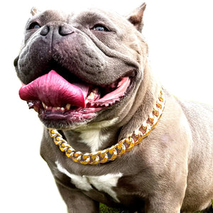 [FASHION-CONSCIOUS - This adorable gold dog collar is great looking for any occasion the ultimate luxury looks great custom fit on anyone "COMFORTABLE - Compared with stainless steel our link dog collar is made from LIGHT METAL material to avoid your puppys neck suffering from heavy chains" "PREMIUM QUALITY - Good polish and no burr on the gold chain dog collar you dont worry about your puppys fur getting clipped. With its double PVD gold plate finish the dog gold chain will never rust or tarnish" APPROPRIATE SIZE - 7/8 inch wide and muti-size from 16 inches to 29 inches our cuban link dog collar matches well with Pitbull Doberman Frenchie bulldog American Bully etc. And cuter looking with clothing such as Hawaiian style sunglasses headset.ip-hop style trends your dog hot and adorable suitable for gifts "WORRY-FREE SHOPPING - If you purchased our cuban link chain for dogs and dont like it you can request a return and refund at any time we will make you satisfied"]