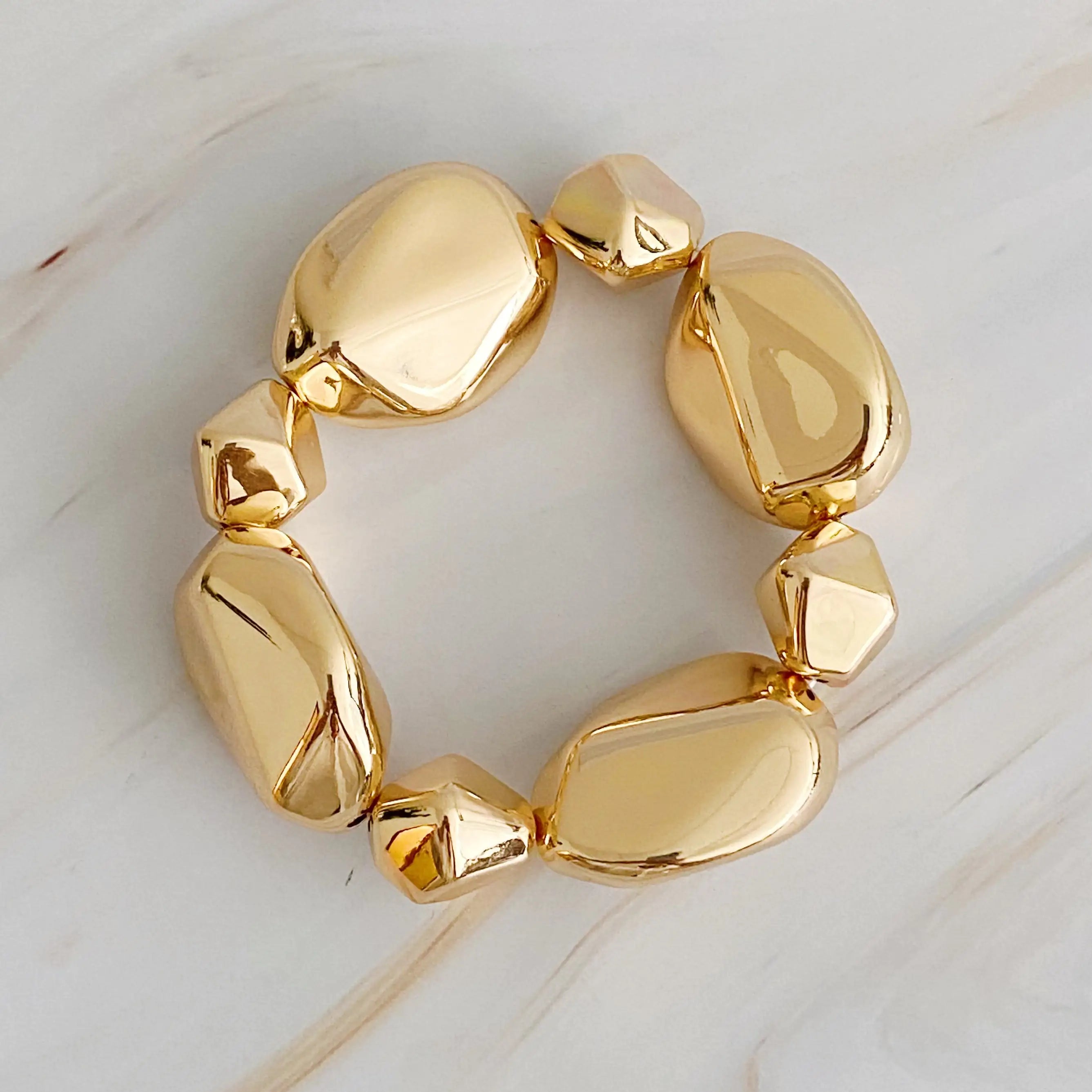 Introducing our Golden Pebble Stretch Bracelet - a sleek, geometric design that effortlessly combines edge and minimalism. Crafted with cool-toned pebbles, this bracelet will add a touch of modern sophistication to any outfit. Stretch design ensures a comfortable fit.